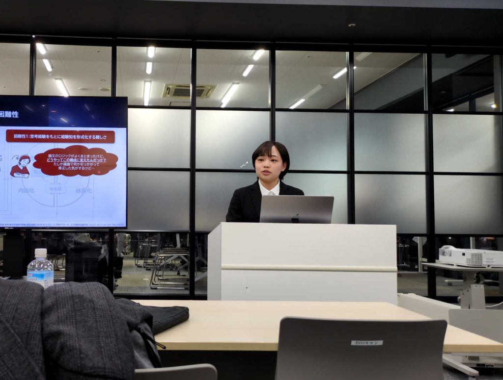 最初に川さんが「思考経験に基づく経験知共有プラットフォームの開発」という題目で発表しました.
