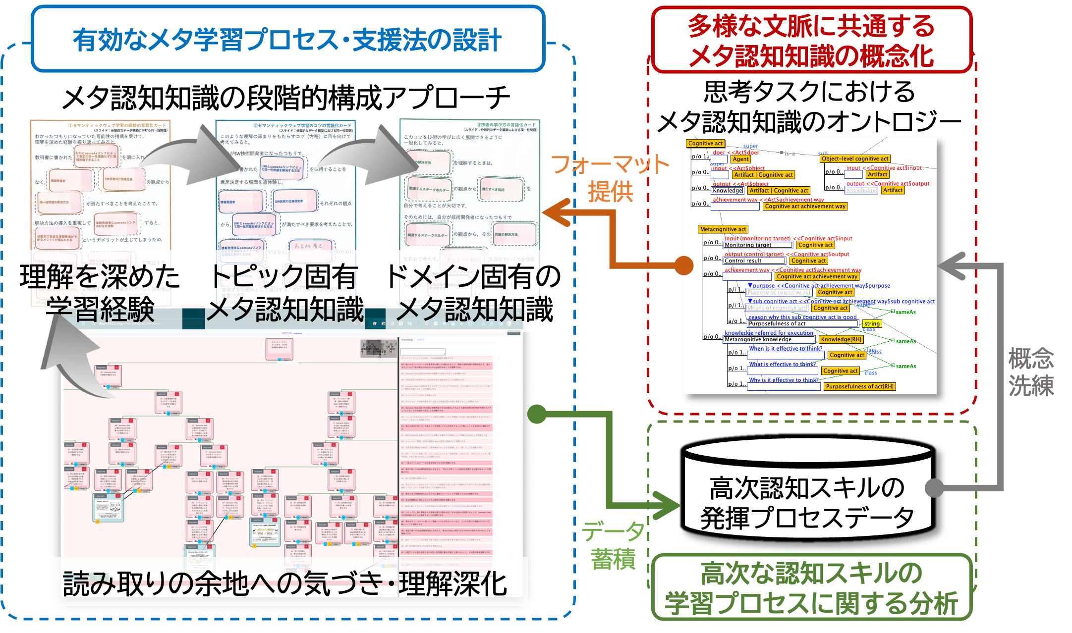 そこで本研究では,「読み取るべきこと・考えるべきことはなにか」,「そのためにはどうしたらいいか」,「これらを自分の学びのいつ・どんなふうに適用して考えればよいか」といった「考え方の戦略を考えて制御」するメタ認知知識の学び(メタ学習)をシステマチックに促す学習プログラムや,知的学習支援システムの開発に取り組んでいます.